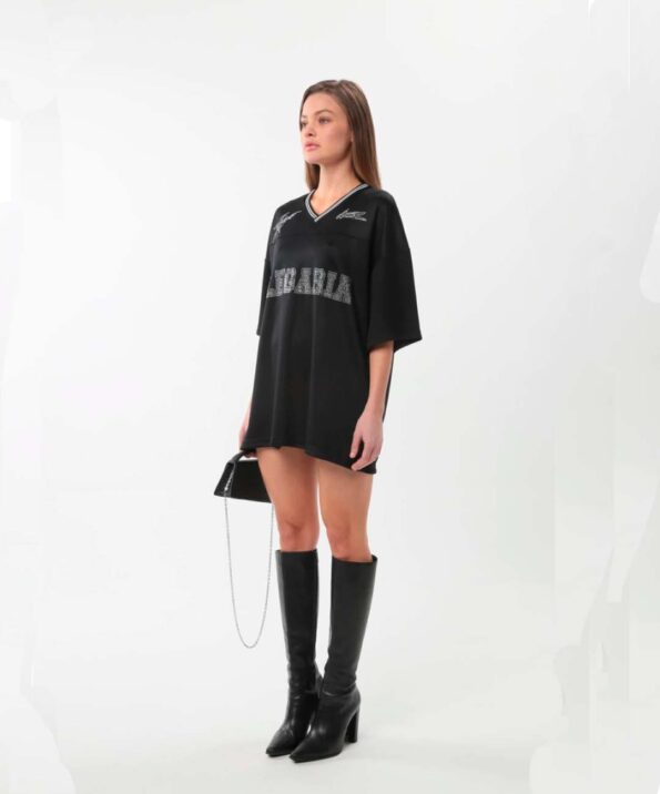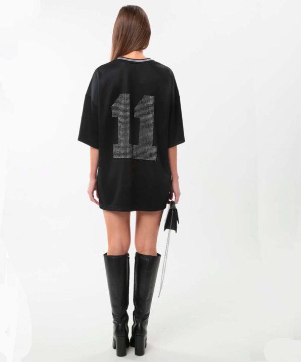LA ESPALDA ES IGUALMENTE LLAMATIVA, CON EL NÚMERO «11» EN TAMAÑO GIGANTE, CUBIERTO TOTALMENTE CON **STRASS PLATEADO** PARA UN EFECTO DE LUZ INSUPERABLE. ESTA PRENDA ES PERFECTA PARA USAR COMO **MINIVESTIDO** CON BOTAS ALTAS O COMO T-SHIRT OVERSIZE CON BIKERS O SHORTS.