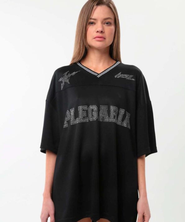 EL DISEÑO ADOPTA LA SILUETA CLÁSICA DE UNA CAMISETA DE FÚTBOL AMERICANO, PERO LA ELEVA CON DETALLES DE ALTO BRILLO. EL CUELLO EN V INCORPORA UN RIBETE DE RAYAS BLANCAS Y NEGRAS DE ESTILO DEPORTIVO. EL FRENTE DESTACA CON LA PALABRA «**PLEGARIA**» APLICADA EN **STRASS O PEDRERÍA** PLATEADA, JUNTO CON SÍMBOLOS ESTRELLADOS EN LOS HOMBROS, TAMBIÉN DE STRASS.